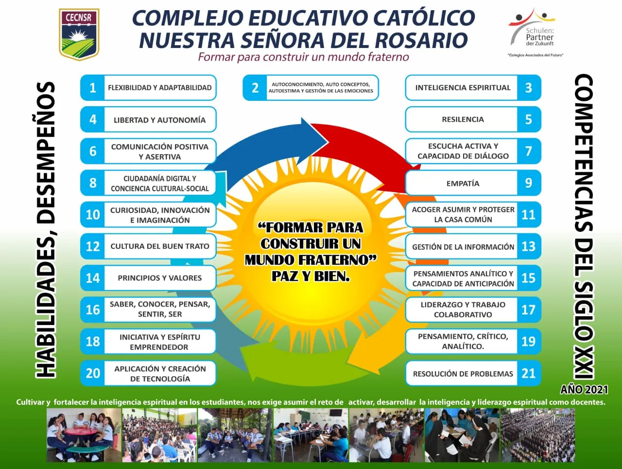El Complejo Educativo Católico Nuestra Señora del Rosario, fiel a su misión evangelizadora y desde la Pedagogía de Jesús, carisma y filosofía HFIC, promueve una Educación Integral según el Modelo Educativo institucional para el desarrollo armónico de la persona en todas sus dimensiones.
